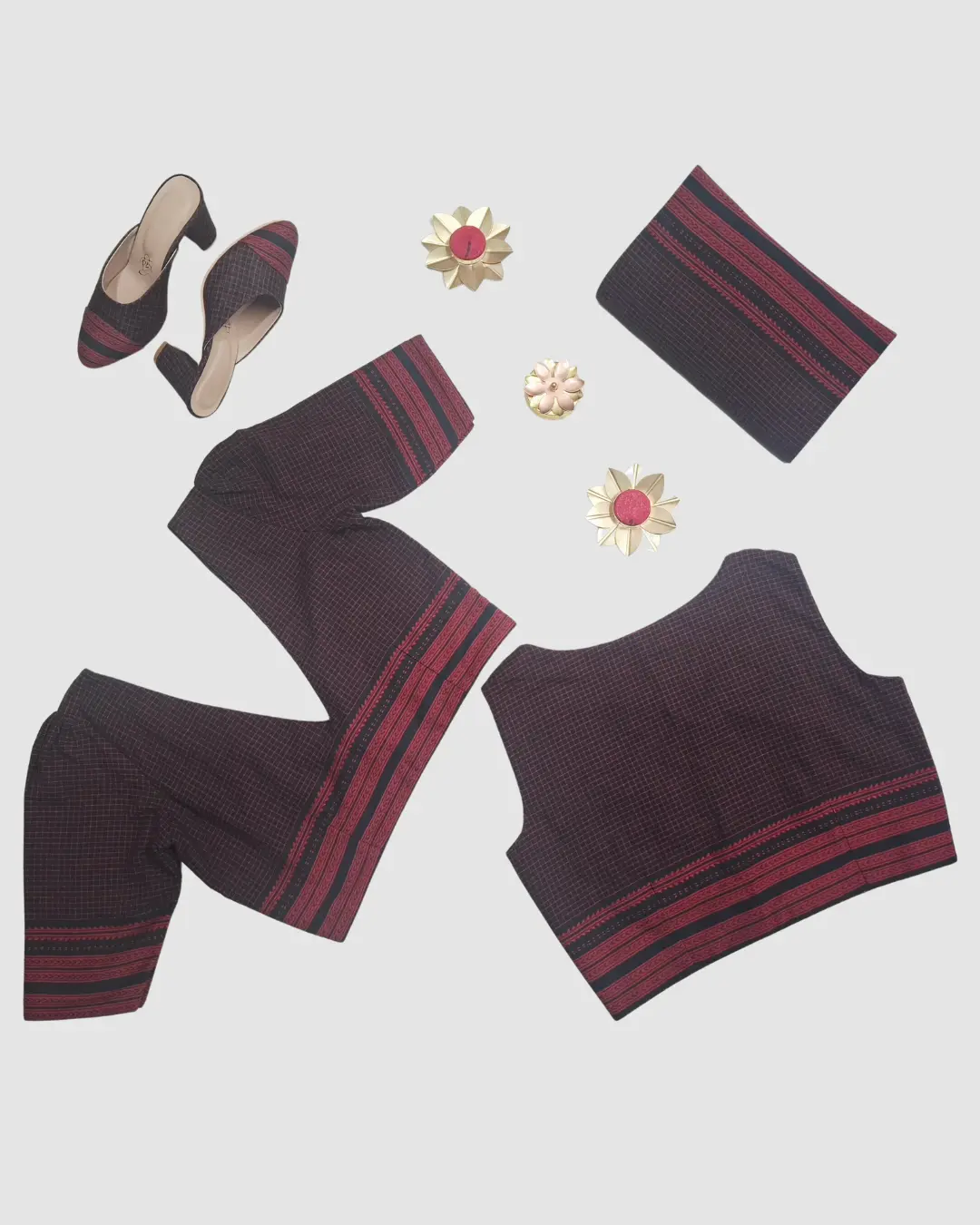 Crafted in soft handloom cotton, this checkered blouse with statement borders pairs perfectly with matching heels and clutch.