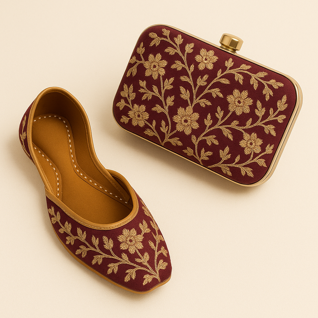 Royal Maroon Jutti & Clutch Combo with gold embroidery – a perfect blend of tradition and elegance.